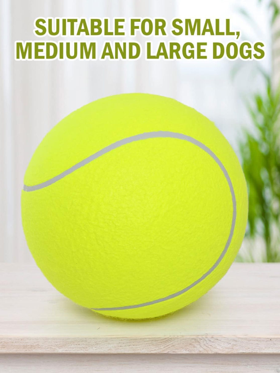 This 9.5"(25 cm) oversized tennis ball is expertlycrafted from high-quality, non-toxic natural rubber,designed to withstand even the most energeticplay sessions. Built with durability in mind, this ball is perfect for active dogs who love to fetch and chase