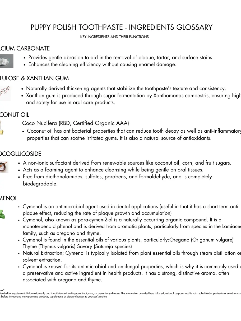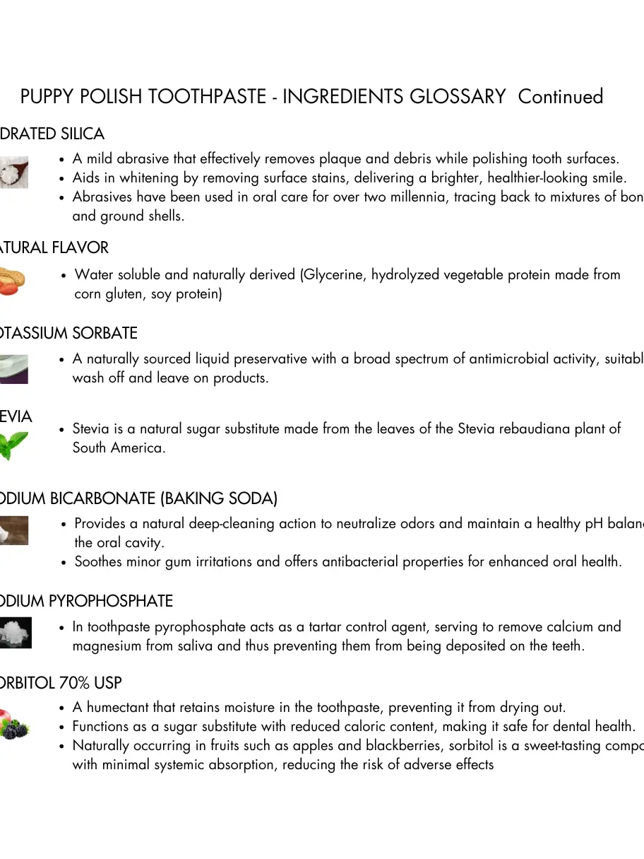 Featuring quality ingredients like Baking Soda, Coconut Oil & Stevia, it guarantees a delicious experience safe for dogs of all ages. It has a very subtle aroma, which humans appreciate. Free from chlorhexidine, DMDM, colors, parabens, triclosan, fluoride, xylitol & heavy metals.