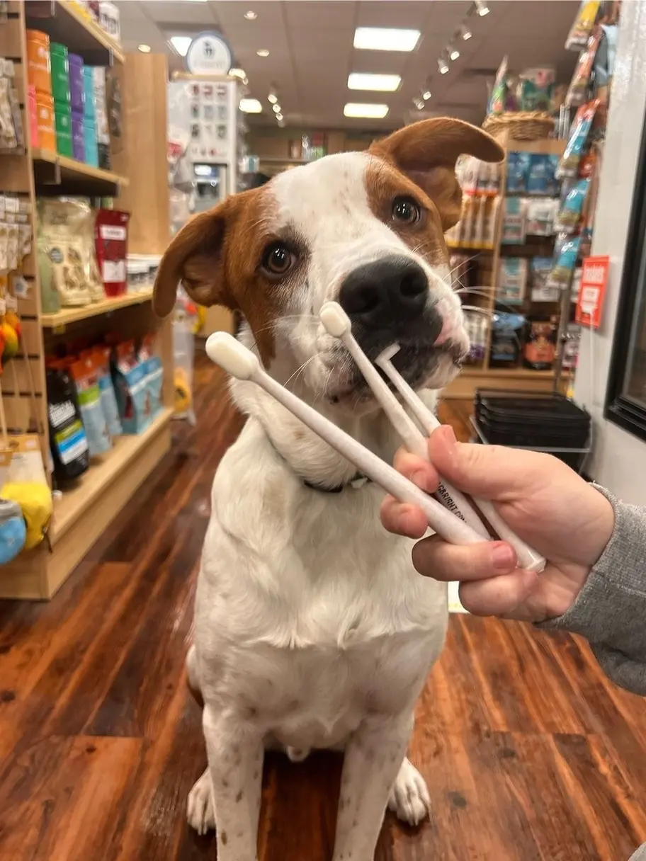 The ultimate softness for your pup! This toothbrush is made from a wheat straw composite upcycled bioplastic. It has over 10,000+ silky PBT bristles to provide the deepest cleaning action while yet gentle on your dogs sensitive gums. This brush comes in a breathable container for easy storage.