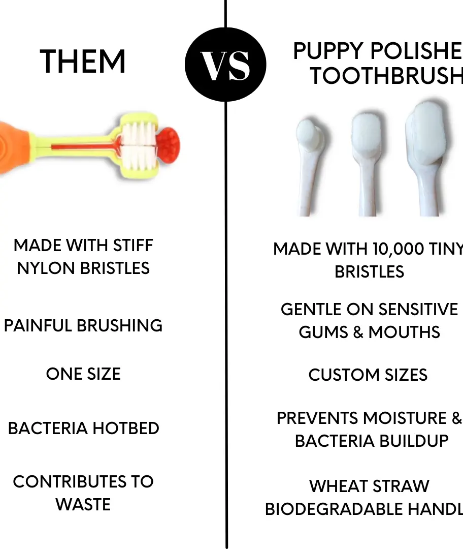 Most dog toothbrushes are made with hard rigid nylon bristles, making the brushing process painful and difficult. Puppy Polisher brush makes the process painless yet effective in plaque and debris removal due to the ultra fine PBT bristles.
